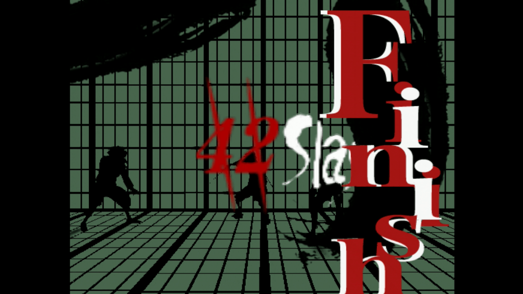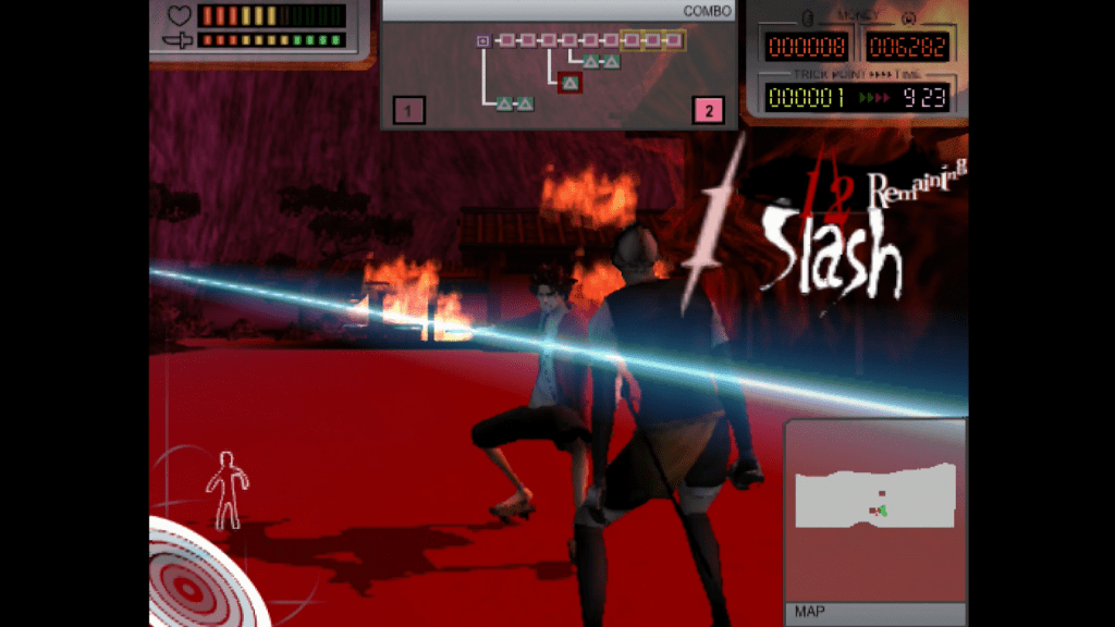 Building the meter unlocks Fury mode, where the screen turns blood red as you dance between defenceless enemies in a screen-clearing flurry of strikes. Max out your tension, and you activate Tate mode. The background fades, replaced by sliding shoji doors adorned with traditional artwork, as you begin a frenzied assault on a single hapless enemy. There’s no finesse here; just mash the buttons to hit as many strikes as possible within a time limit. It’s pure “Track & Field” button-bashing energy with no intent beyond getting your blood pumping. Hit 100 strikes, and it escalates even further as you enter Trance mode. Backlit by coloured light, your character becomes a black silhouette, and full control returns as your blade dances around one hundred enemies in a frenetic samurai disco to a high-tempo eurobeat soundtrack.