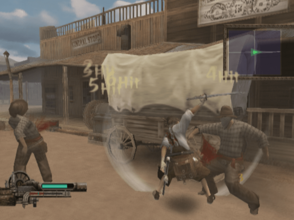 Samurai Western is a (very) loose re-imagining of both Yojimbo and A Fistful of Dollars through the lens of mid-2000s Japanese action game design, taking the protagonist of one and dumping him in the world of the other. Whether it feels like playful homage or cheesy, derivative pastiche will depend on your tastes, but for me, it’s clear that Tenchu developers Acquire had a lot of love and respect for both classic westerns and samurai cinema that really shines through here. It’s all presented with a big wink and a nod, and it pulls off this inherently ridiculous premise with an effortless, quirky cool—a very hard tone to get right. The story itself is nothing to write home about, but the love that’s been poured into its presentation is infectious.
